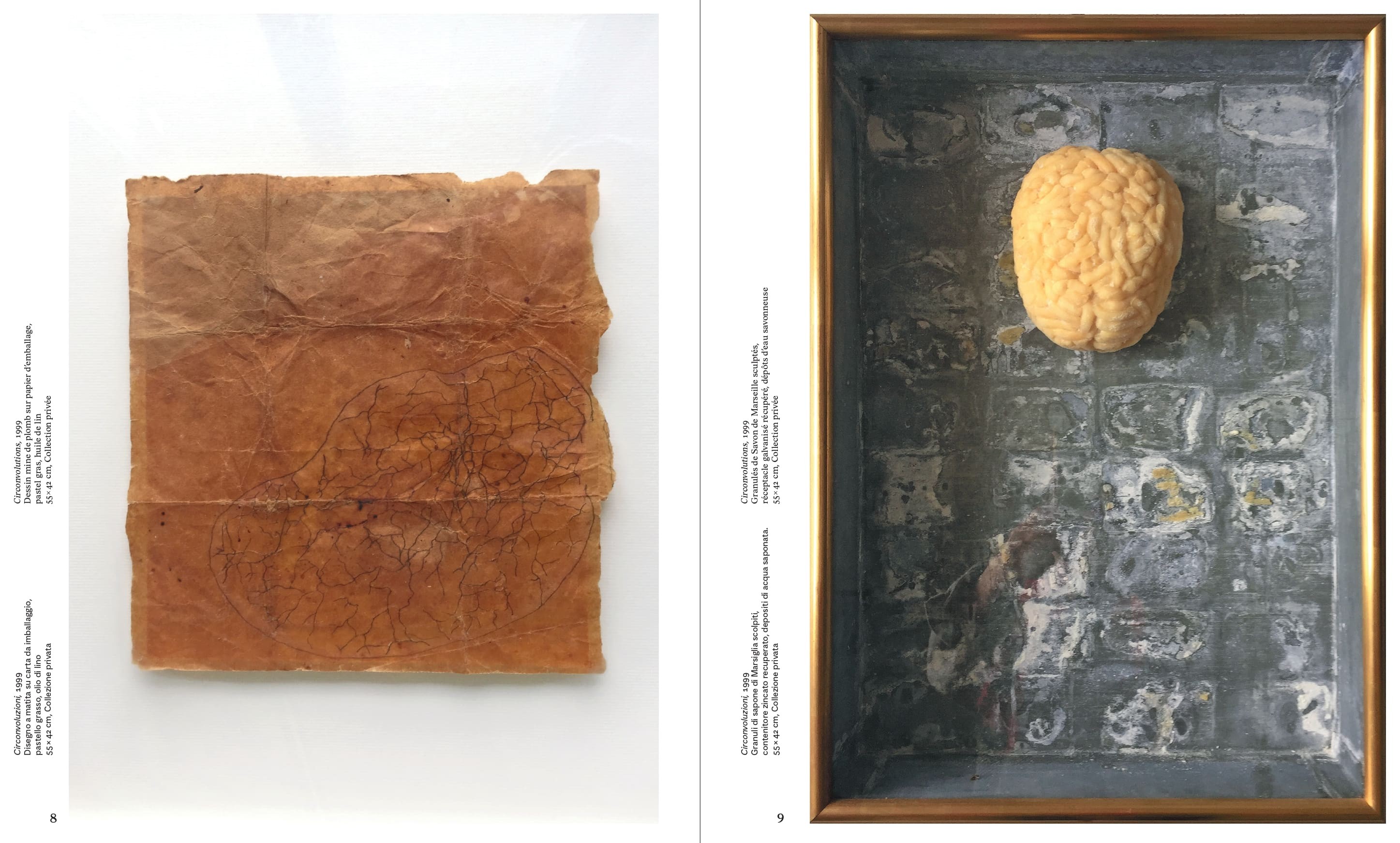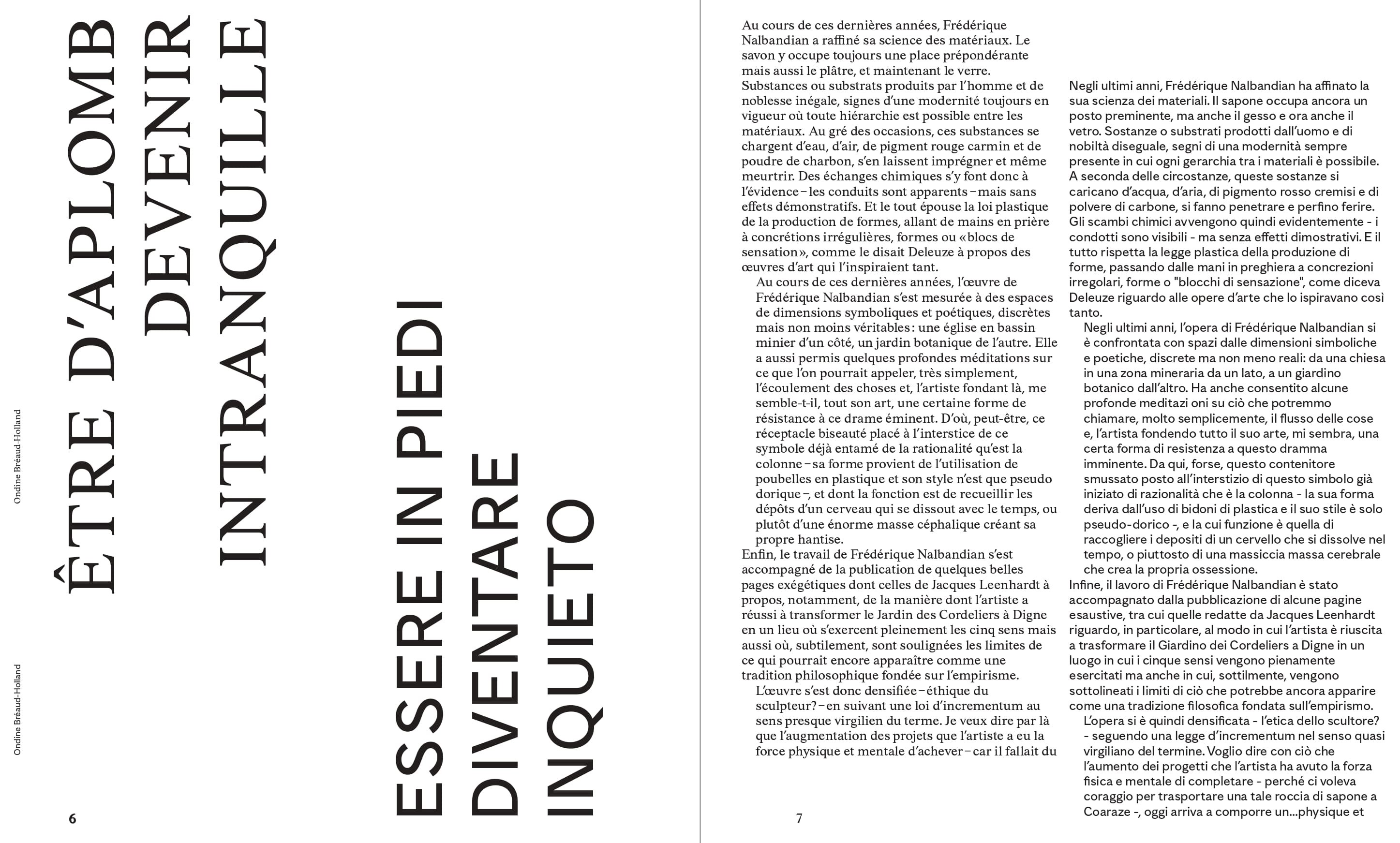 L’ouvrage est une exploration de la matérialité, l’écoulement du temps, la gravité, éléments fondamentaux de mon travail, développés depuis le tout début de ma formation à la Villa Arson à partir de deux matières récurrentes ductiles et blanches, le plâtre de Paris et le savon de Marseille. Il est traversé de la substance omniprésente du savon et du plâtre, de leurs états solide, liquide, ou mousseux, mais aussi de roses rouge fraîche, fanées, de cerveaux, de colonnes, d’or et de bitume. Il est question d’une méditation sur le passage du temps, ses cycles, la limite du vivant, sa mémoire, par une lente disparition de la matière, par l’ensevelissement ou encore par la trace, la chute, le fragment, le débris, les ruines. Frédérique Nalbandian