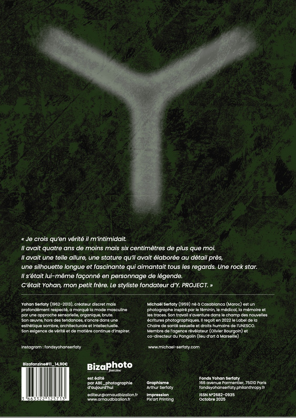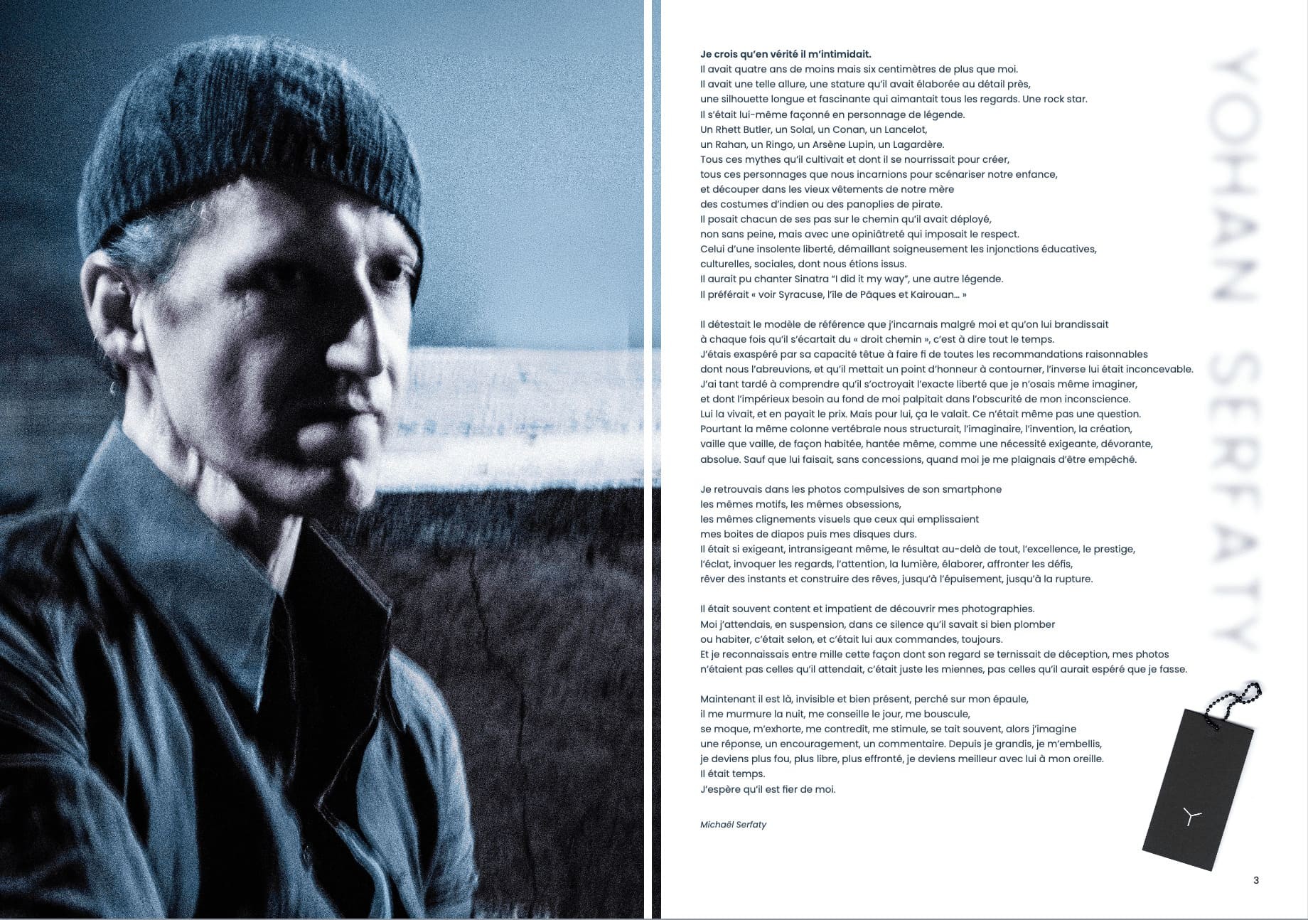 Je crois qu’en vérité il m’intimidait. Il avait quatre ans de moins mais six centimètres de plus que moi. Il avait une telle allure, une stature qu’il avait élaborée au détail près, une silhouette longue et fascinante qui aimantait tous les regards. Une rock star. Il s’était lui-même façonné en personnage de légende. C’était Yohan, mon petit frère. Le styliste fondateur d’Y Project. Michaël Serfaty